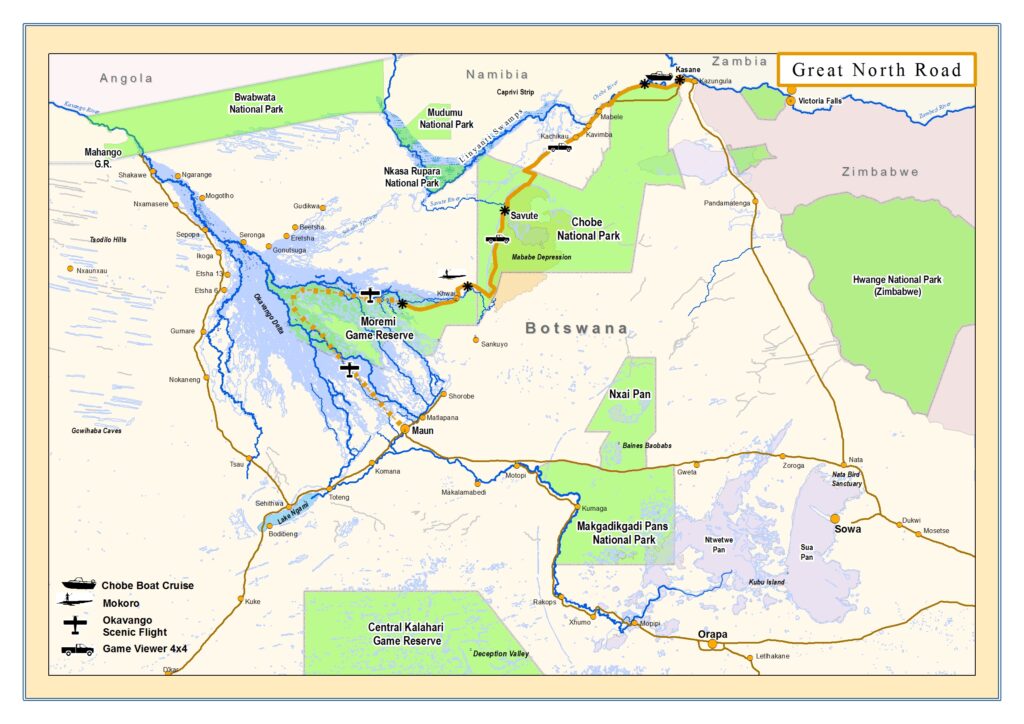 The Great North Road is our classic 10-night serviced safari from Maun to Kasane (or vice versa), taking you through the Xakanaxa and Khwai regions of the Moremi Game Reserve, the northern plains of Savute, and the Chobe Riverfront, which borders the Caprivi and Zambezi regions of Namibia.